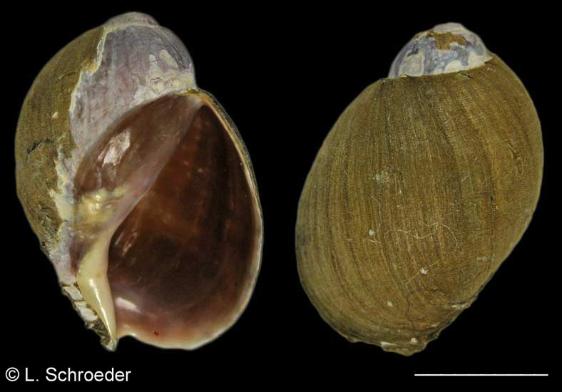 tan to dark grayish shell. The aperture is glossy reddish-brown.