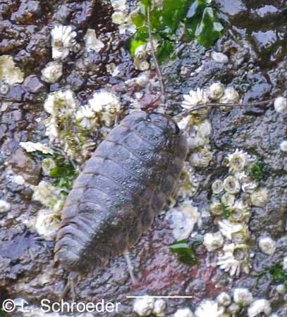Very rarely intertidal, greenish-gray to reddish, carapace and legs covered in scale-like plates