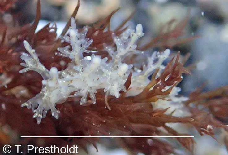 This is infrequently seen intertidally. It has a white body and the cerata are tipped with opaque white, orange, red or brown. A white line extends down the back to the tip of the tail. A recent DNA study determined that Dendronotus diversicolor is not a unique species and is now considered to be Dendronotus albus.