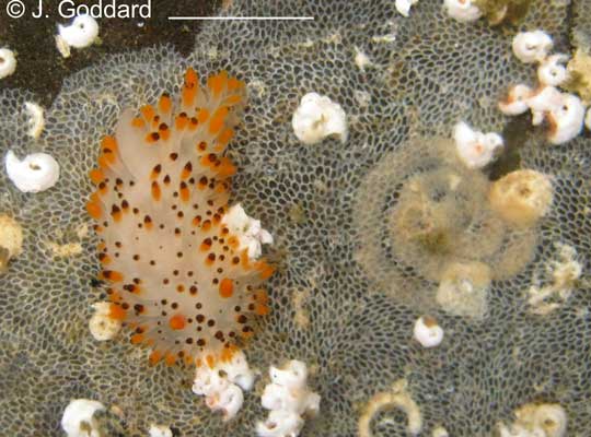 summer. Photo shows its eggs and the encrusting bryozoan it feeds