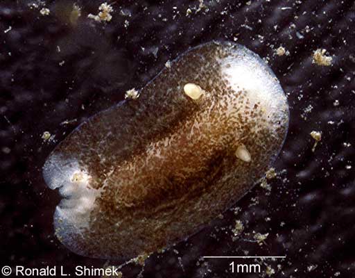 This tiny species is hard to spot. It is flattened with a mottled brown and white dorsum. The ends are white.